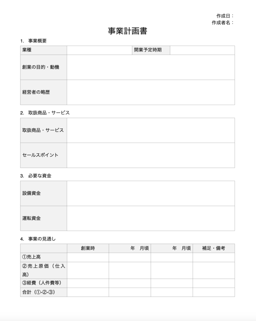 一枚で収まる形の事業計画書や、もう少し詳細が書けるもの色々あるので良かったらご自分に合うものを検討してください。